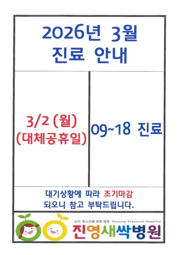 2026년 3월 진료 일정 안내 페이지 정보 작성자 진영새싹병원 작성일26-02-23 18:15 조회6회 댓글0건 관련링크 목록 본문 점심시간 : 13:00~14:00참고하시어 본원 이용 및 방문에 불편함 없으시길 바랍니다. 댓글목록 등록된 댓글이 없습니다. 목록